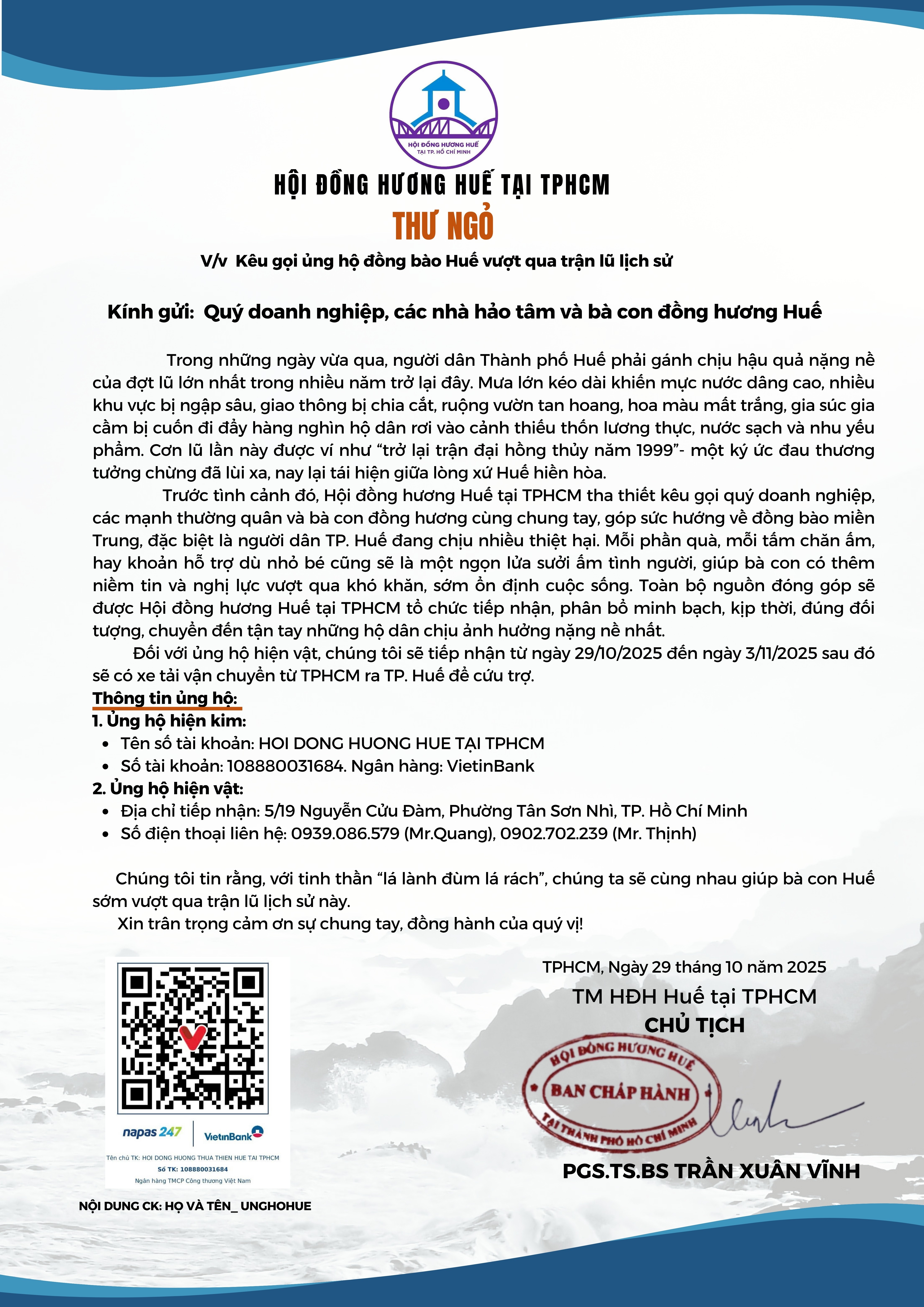 Hội đồng hương Huế tại TP. Hồ Chí Minh tha thiết kêu gọi doanh nghiệp, cá nhân, các mạnh thường quân và bà con đồng hương chung tay hướng về Huế, cùng giúp bà con vượt qua khó khăn này.
